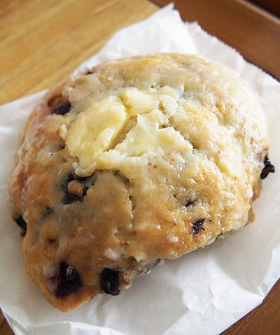 口コミでも大人気のブルーベリークリームチーズスコーンとスパムむすびを買いに行きました。ブルーベリークリームチーズスコーンは思っていたより、意外と甘さ控えめで美味しかったです。スコーンってパサパサな印象ですがこちらのものはしっとりとしてました。