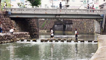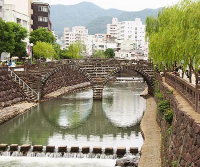 時間があったので、眼鏡橋に行ってみました。雨の予報でしたがラッキーなことに降られることなく水面に映った半円をあわせて眼鏡のように見えました。国の重要文化財で石造二連アーチ橋。寛永11年(1634)に作られた日本初のアーチ石橋です。