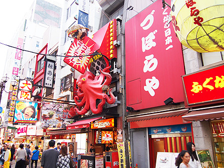 道頓堀の中心に建つ、大きなたこオブジェが目立つ、