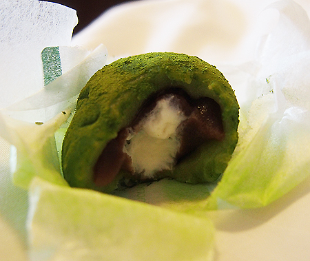 大福の中に、こしあんとクリームが入っていて、上から抹茶がまぶしてあります。- 旅行時期