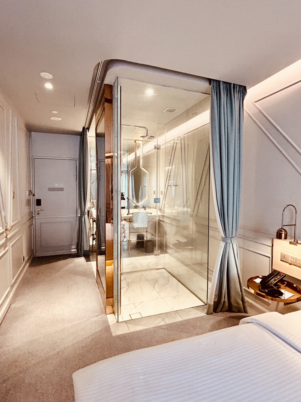 お部屋は、とにかく天井が高い。バスルームはスケルトンシャワー室。