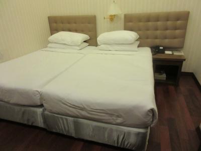 部屋は昨年と違いましたが、昨年と同じように白を基調にしたきれいな部屋で、広さは日本のビジネスホテルより若干広い感じでした。浴室は、浴槽はなく、シャワーとトイレの間の仕切りがないため、シャワーの使用後は床が水浸しになります。ただ、スペ−スが広めなので便器が濡れることありませんでした。また、シャワ−は水圧が少し弱かったが問題はありませんでした。また今回は6階であったせいか外の音はあまり聞こえませんでした。