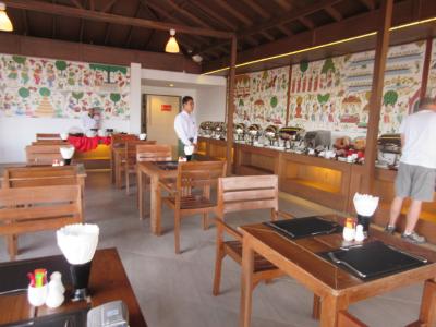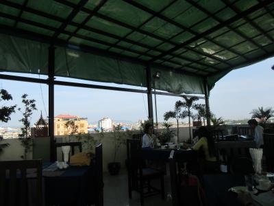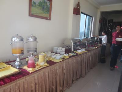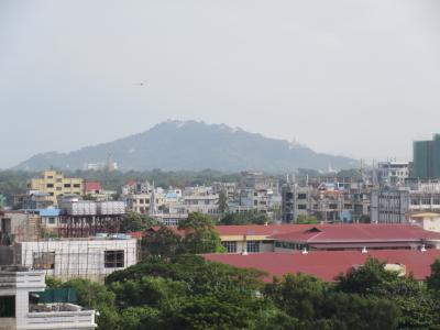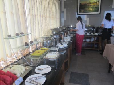 朝食は、マンダレ−ヒルや市内が望められるレストランで、バイキング形式の朝食(ミャンマ−風中華料理と一般的な洋食)です。朝から素敵な景色で美味しい食事は最高です。