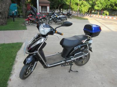 操作は、スイッチをONにし、右ハンドルのグリップを回すとスピ−ドがで、両サイドのレバ−を引くとブレ−キがかかる仕組みです。自転車が乗れれば大丈夫ですが、最初は少し大変です。でも5分もすれば一応大丈夫でしょう。料金は、ホテルで申し込むと10000〜12000K/dayですが、ホテルの周りにはレンタル店があり、そこでは 約8000K〜10000K/day(当日のみ)でした。営業時間は、多くは 8:00〜20:00ですがお店によって若干違うようです。