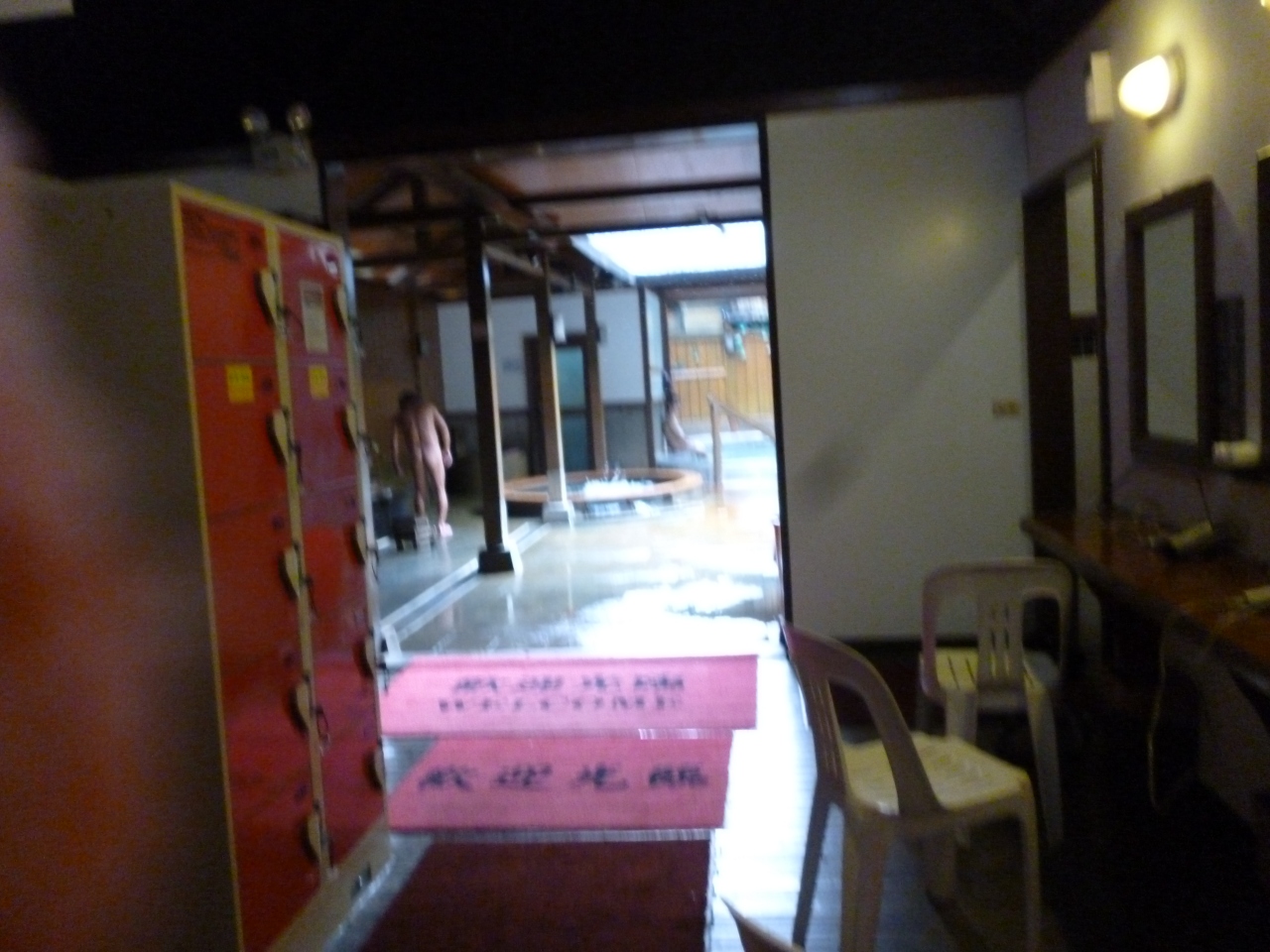 大浴場は、約8名が入れる約43℃の浴槽と、それより少し小さい約41.5℃の浴槽と、1名用の水風呂の、3つの浴槽があります。着替えは、昔の湯治場のように浴槽と洗い場と脱衣場が一体型で扉などの仕切りはないため、浴槽の脇で着替えます。 そのため着替える場所(床)は濡れていて着替えるのが大変です。また、着替えは壁の棚に入れるため湯船から丸見えで盗まれる可能性は少ないのですが、一応入り口横にコインロッカ−(たぶん20元)があります。さらにトイレは浴室の一角にあり、ドアはありませんので注意。