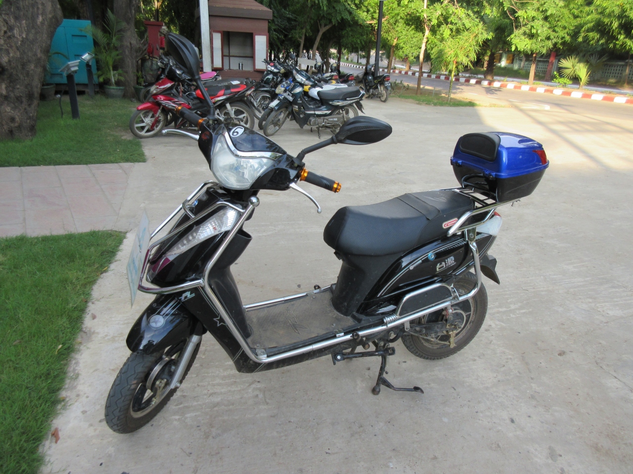 操作は、スイッチをONにし、右ハンドルのグリップを回すとスピ−ドがで、両サイドのレバ−を引くとブレ−キがかかる仕組みです。自転車が乗れれば大丈夫ですが、最初は少し大変です。でも5分もすれば一応大丈夫でしょう。料金は、ホテルで申し込むと10000〜12000K/dayですが、ホテルの周りにはレンタル店があり、そこでは 約8000K〜10000K/day(当日のみ)でした。営業時間は、多くは 8:00〜20:00ですがお店によって若干違うようです。