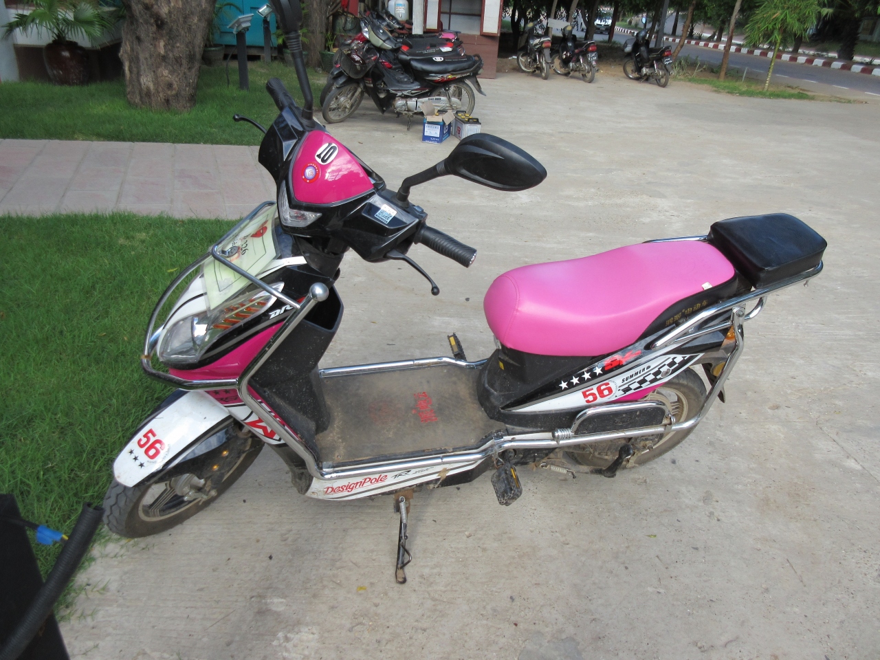 操作は、スイッチをONにし、右ハンドルのグリップを回すとスピ−ドがで、両サイドのレバ−を引くとブレ−キがかかる仕組みです。自転車が乗れれば大丈夫ですが、最初は少し大変です。でも10分もすれば一応大丈夫でしょう。料金は、ホテルで申し込むと12000〜15000K/dayですが、ホテルの周りにはレンタル店があり、そこでは、古いものは約8000K/day、新しいものは10000K/dayでした。営業時間は、7:00〜20:00ですがお店によって若干違うようです。