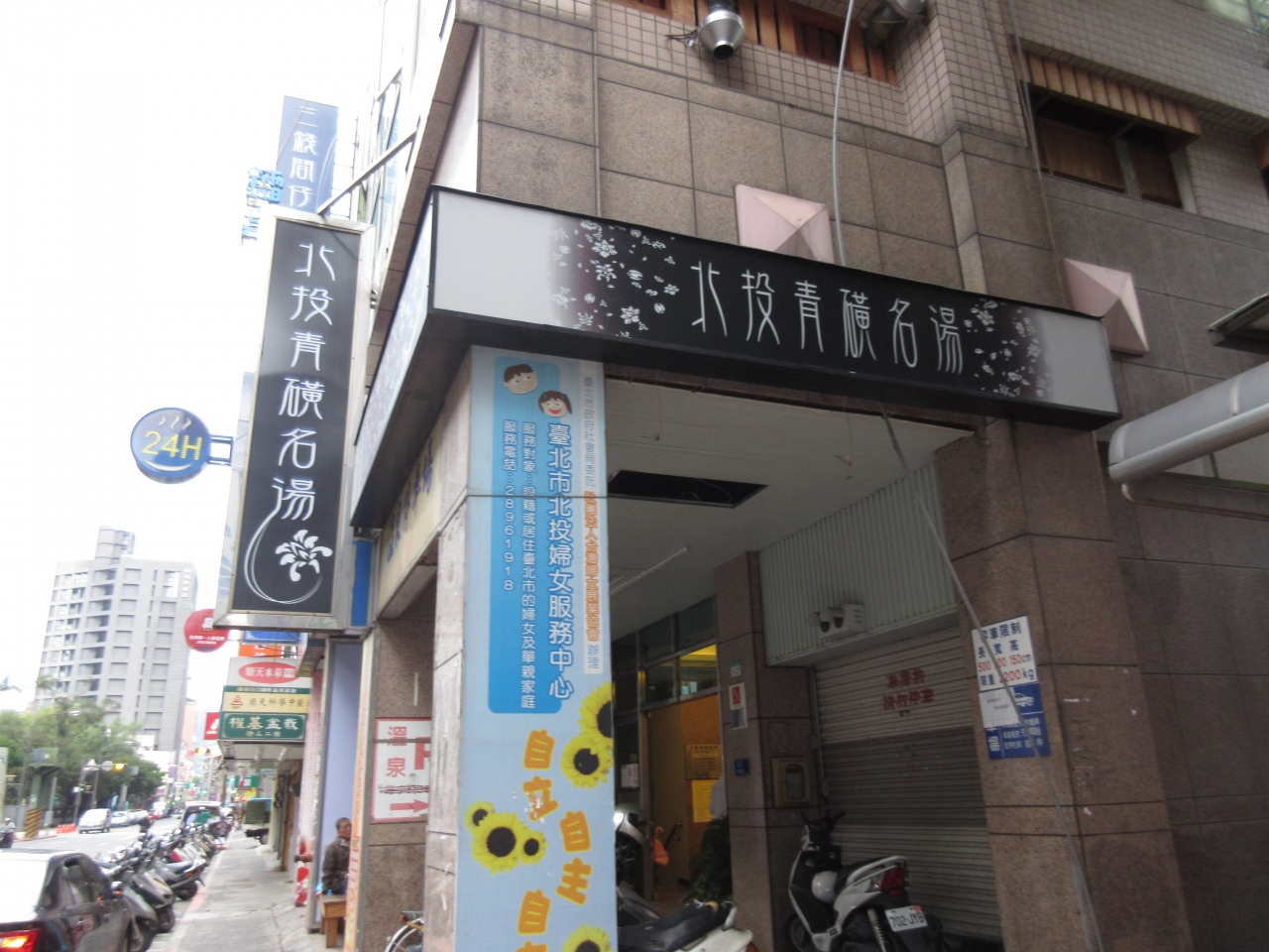 MRT台北駅から北投駅に行き、改札口から新北投方面に約600m(約7分)、長安派出所横のところに 北投青磺名湯(24時間営業)があります。店の正面は比較的大きな道路でバス停があります。