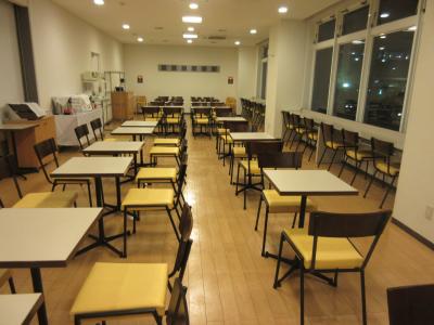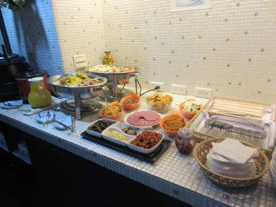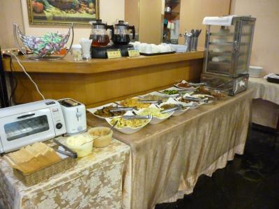 朝食は地下1階で、席はあまり多くありませんが部屋の数からすると座れなくなることはないでしょう。主食はお粥とパンで、おかずは5〜6種類(半分程度日替わり)と飲み物はジュ−スとドリップ・マシンの珈琲があります。料理は少し胡椒がききすぎるものもありましたが美味しく頂きました。 ただ問題は、朝食時間が7:30からと遅い事です(何年前から早くしてくれとお願いしているのですが)。