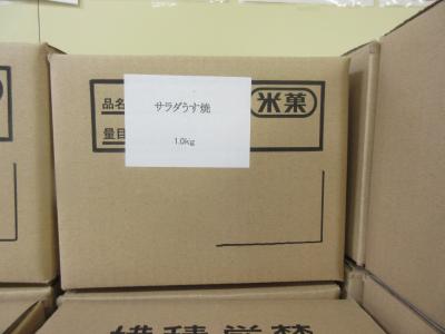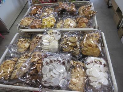 価格は、にこやか(ハッピ−タ−ン) 1Kg 520円・1.8Kg880円で、すりみつせん(ぽたぽた焼) 0.6Kg 420円、サラダうす焼 1.0Kg 420円 などで、正規の1/4くらいの価格で購入できます。商品名がわからない場合は、店員さんに聞いて下さい。なお、多くは食べられない方には小袋用が100円で販売されています。