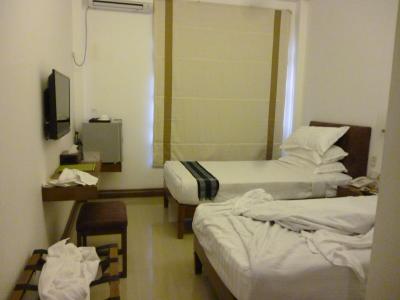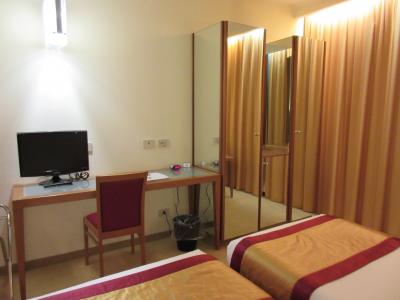 部屋は、比較的新しく、白を基調にしたきれいな部屋で、広さは日本のビジネスホテルより少し広い程度である。浴室は、浴槽はなく、シャワーとトイレの間の仕切りも無く、シャワーの使用後は床が水浸しになる浴室である。ただ、比較的広めに出来ているので便器が濡れることはない。また、浴室用サンダルもある。シャワ−の温度は問題なかったが、水圧が少し弱かった。しいて問題点を上げると、小さな虫が数匹いたことと、狭いながら比較的交通量が多い道路に面しているからか、心持ち室外の音が聞こえたこと