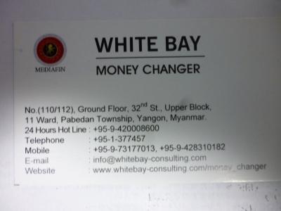 WHITE BAY Money Changer は、そのミャンマ−でほぼ唯一、日本円から現地通貨のチャット(K)に両替できる店です。もちろん米ドルも可能ですし、少しぐらい汚れた紙幣でもOK。また、レ−トは10000円でも5000円でも同じで、空港よりもレ−トは良かった。