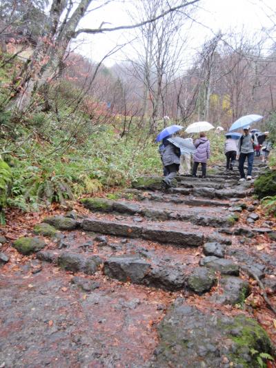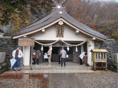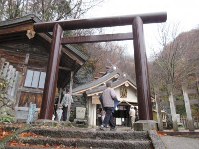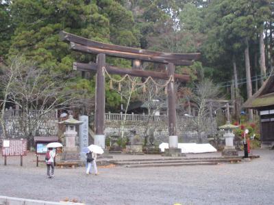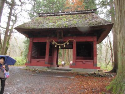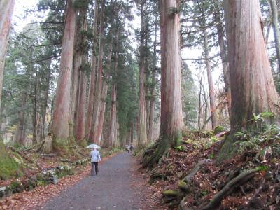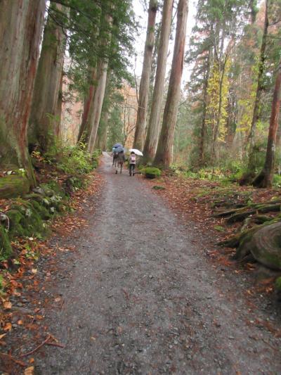 奥社には、傘を差し、参道入り口から随神門までの約1.2m(ほとんど平坦)を15分、随神門を過ぎると樹齢400年以上の杉並木を約700m。ここに来るといつも高野山の杉並木を思い出します。残りは約300mですが、これからが大変で、自然石混じりのかなり急な石段坂を登るのです。運動不足の方はかなりきついですし、ハイヒ−ルの方は危ないのでここで引き返して下さい。ここを頑張れば奥社です。随神門から約1.0kmで、約20分でした。奥社に10分程ほど休憩(お参り)した後、転ばないように参道入り口まで戻って来たら合計1時間 15分の参拝でした。