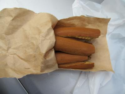 次に「ぽっぽ焼き」は、発祥元の新発田市を中心に、新潟市周辺や三条市などで、おもに祭りや縁日などの屋台で、まれにスーパーの駐車場等で売られており、一般の小売店などでは売っておりませんでしたが、「アヤメ ポッポ店」(バスタ-ミナル1F:スタバ横)は、縁日と関係なくいつでも買うことができます。では、ぽっぽ焼きとはどんなものかと言いますと、薄力粉に黒砂糖と水、炭酸、ミョウバンを加え、ぽっぽ焼き専用の焼き器で焼き上げる、茶褐色で細長く扁平な、パンのような菓子なので、阿賀北以北では蒸気パンと呼ばれています。熱々が美味しいのですが、冷めてしまっても黒糖パンのように少しモチモチして、ほどよい上品な甘さでおいしいです。なお、ぽっぽ焼きは10本350円で、10本単位にお販売です。
