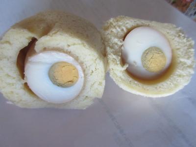 では、たまご饅頭とはどのような物かと言いますと、カステラ風の少し甘い生地の中に、生醤油で味付けされた煮たまごが丸ごと1個入ているもので、生地の甘さと煮たまごのしょっぱさが絶妙のバランスで本当に美味しかったです。また、一口食べた時、柔らかい生地と少し堅めの煮たまごの感覚が、不思議な感覚で楽しめます。1度味わってみて下さい。お茶うけや間食、夜食にも最適なお饅頭です。