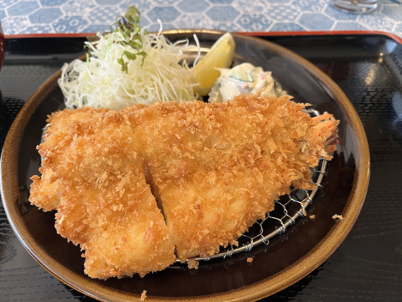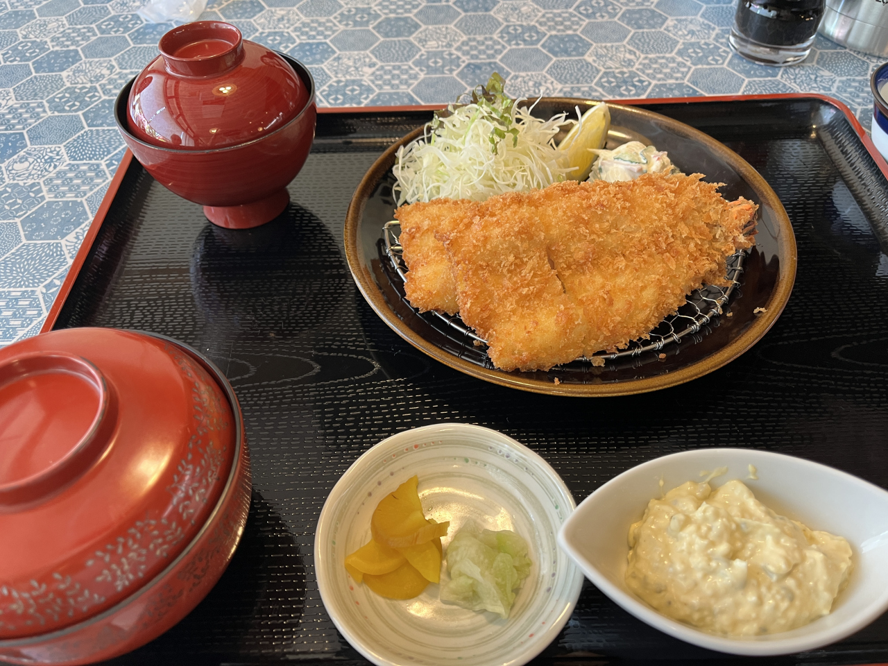 お店の定番メニューの開き海老フライ定食をオーダー(5人とも)、大きな開き海老が2尾、タルタルソースを付けて頂きました。サクサク、プリプリうまっ!ですね。海老が大きくボリュームあるので、2尾だと結構おなかがきついって感じです。ちなみにご飯は、大、普通、小が選択できて、普通を選んだのですが、小でもよかったかな~って。