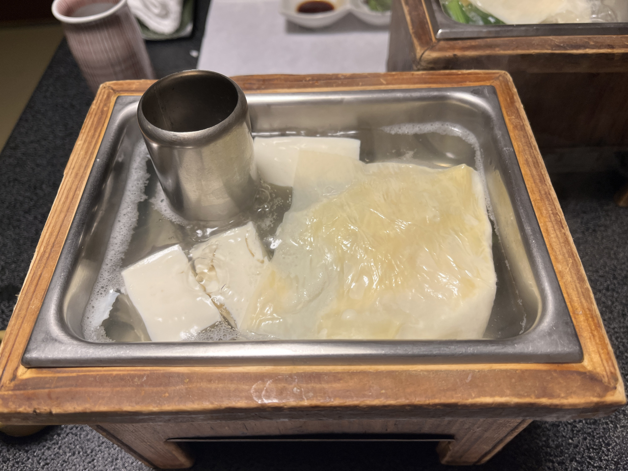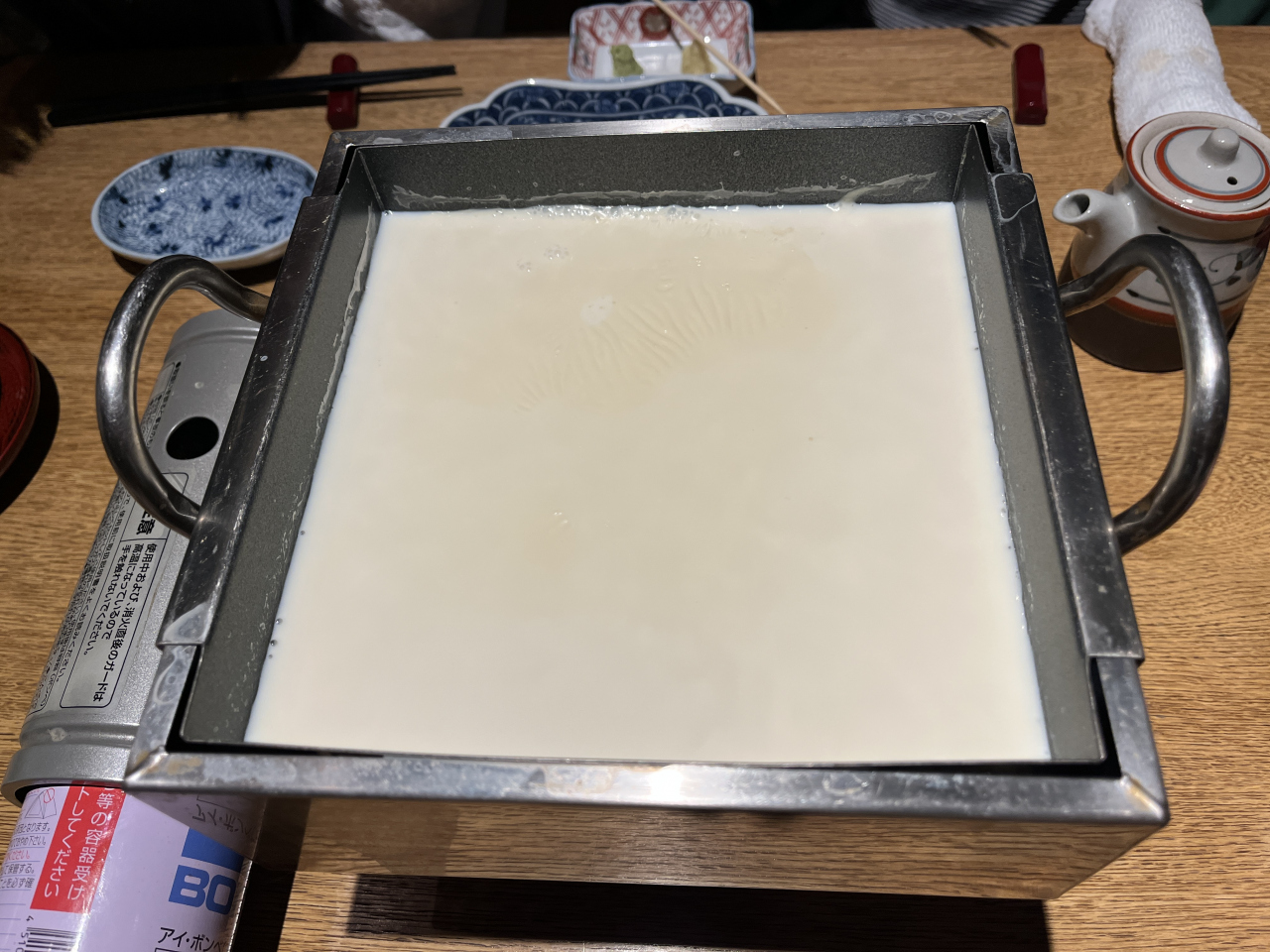 追加で、若竹煮、アスパラとブロッコリーの天ぷらも頂きました。ブロッコリーの天ぷら初めてです。引き上げ湯葉は、それなりに時間が掛かるもので、4人で10枚くらいできたかな~。最後に、にがりを入れて頂き、おぼろ豆腐でフィニッシュ。おぼろ豆腐がうまい!