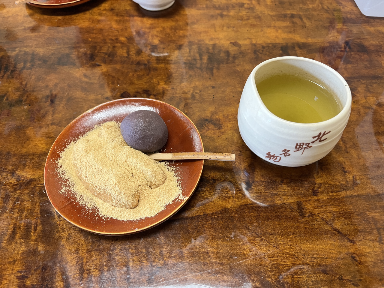 お店に入って奥のテーブル席、紅梅(あわもち3個です)を頂きました。あんこが1個ときなこが2個です(通常は逆のようですが、あんこが足りないとのことできなこ2個となりました)。素朴でおいしいお餅ですね。甘さ加減のよいあんこでやわらかお餅です。最後、お皿に残ったきなこも食べきりたかったのですが、竹の楊枝ではどうにも・・・でした。