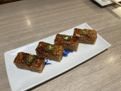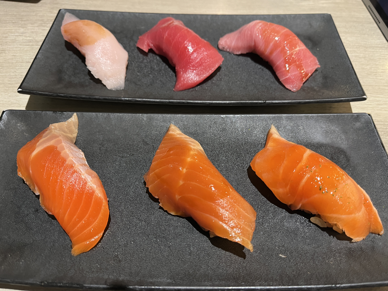 まずは、熟成まぐろづくしと琴浦サーモンづくしをオーダー、少し待つとレーンに乗ってやってきます(結構早い!)それぞれ3貫ずつ並んでます。まぐろづくしは、中トロ、赤身、びんトロ、サーモンづくしは、サーモン、漬け、トロです。サーモン漬けと中トロ、赤身がうまい!でした。