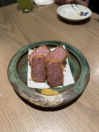 料理は、重さゼロのアジフライの半熟と完熟、へしこのポテサラ、雲仙ハムカツ、トウモロコシの岩石揚げ、土鍋ごはんは、時間が30分くらいかかるとのことで、鰻とトウモロコシの土鍋ご飯を同時にオーダーしました。