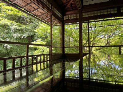 拝観料2000円を払い靴を脱いで中に、2階に上がると、うわぁって、緑いっぱいの景色が目の前、テーブルに映る緑と合わさって撮影タイム。たくさん写真を撮りました。