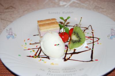 隣の手作りウッドデッキ調テラスのテーブルで待ちます。