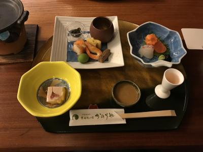 部屋は、2階の10畳の和室。外は雨で窓からの景色はなにも見えずです。夕食は、1階のレストランで頂きました。「竹」懐石です。アワビのサルサソース焼きと和牛の陶板焼きがメインで、カレイの唐揚げ、若竹煮など、多彩なメニューでどれも美味しく頂けました。陶板焼きで脂が飛ぶのがちょっと難ですけど。。