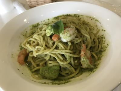 家族4人、それぞれで、好きなものということで、トマトソースのパスタとジェノベーゼ2つと、とパンケーキをオーダー。パンケーキは、3段重ねのパンケーキにバナナとアイスが乗っかっています。パスタは、サラダ付き、まずまずの味です。