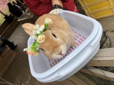 うさぎハウスに到着。うさぎに触れ合えるチケット500円を買って、順番待ちです。順番がくると、うさぎハウスに入り、うさぎが配られてきます。カゴに入ってきます。子供の膝の上に置いて、触れ合い開始。おとなしく、かわいいですね~。撫でて写真撮って、しばらく、うさぎと触れ合いです。満足でした。