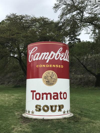 作品の中で、インパクトがあったのは、草間彌生のミラールーム(かぼちゃ)とアンディウォーホールのキャンベルズトマトスープと特別展示の狩野永徳「虎図」ですね。あとは、磯崎新設計の建物そのもののインパクト。黒塗りの廊下が特に印象的です。