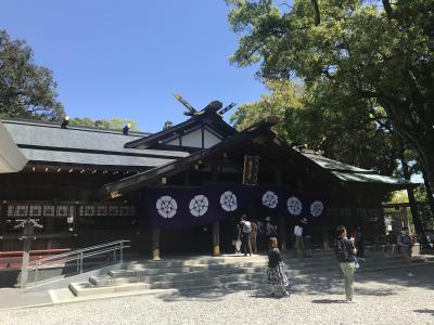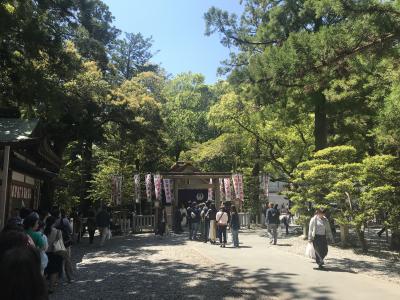 鳥居をくぐると境内があり、境内の中ほどに方位石がありました。方位石の場所が、古殿地とのことです。正面は、社殿です。まずは、お参り。GWの最中ですが、4組待ち程度で、それほど待たずにお参りできました。ただ、御朱印を頂く場所には、長い列!です。