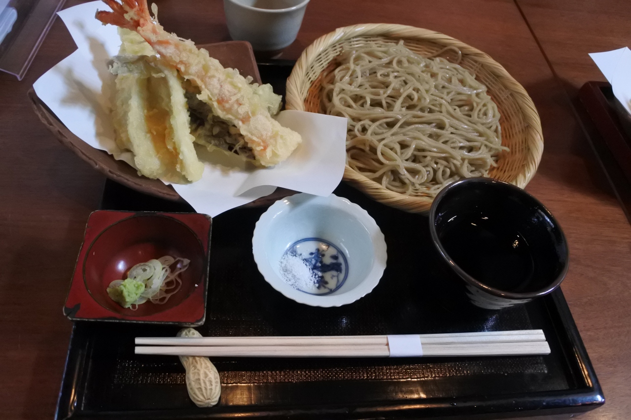 美味しそうなお蕎麦がきました。最初はお塩でお蕎麦を召し上がってくださいとのこと。さっそく頂きました。塩をかけてお蕎麦を一口。塩がいいですね~。天ぷらは、エビ、キス、タケノコ、ナス、サツマイモにオクラ。こちらも美味しい天ぷらでした。