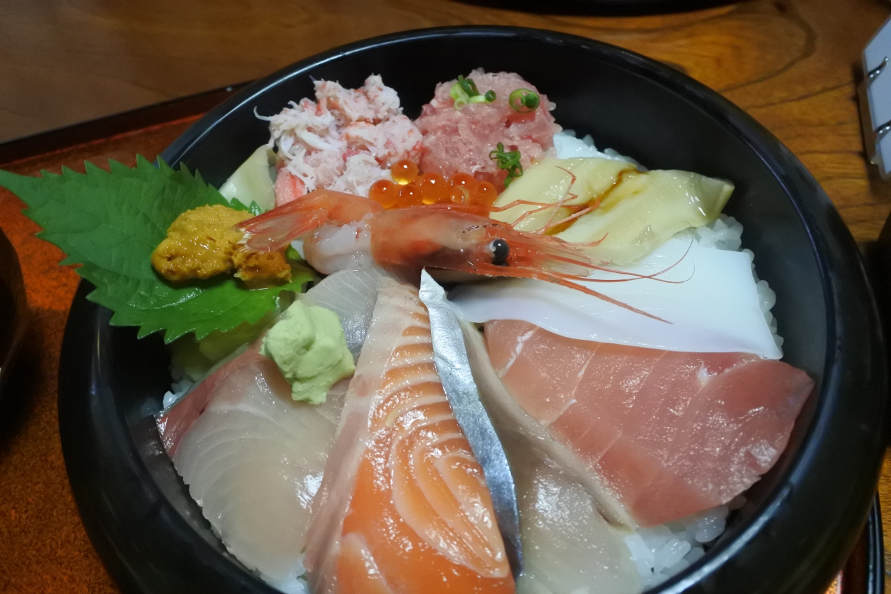 これが美味しかったですね。海鮮丼は10種の海鮮が乗っかっていて、特に、ウニと甘エビが甘くて、美味。子供たちのマグロも美味しかったようです。ガイドブックによく載っているような、丼から飛び出しているような海鮮丼ではないですけど。