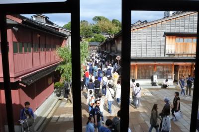 金沢への旅行、お昼前に金沢駅に到着、ひがし茶屋街に直行しました。橋場町でバスを降り、歩いてひがし茶屋街に。GWの最中なので、どこも人、人、人です。