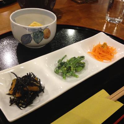 まずは、前菜として、ひじきとのらぼう菜と人参の三種盛に揚げ出し豆腐。