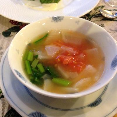 ヤリイカのネギソースあえの3つです。スープは、カブとトマトのスープ。