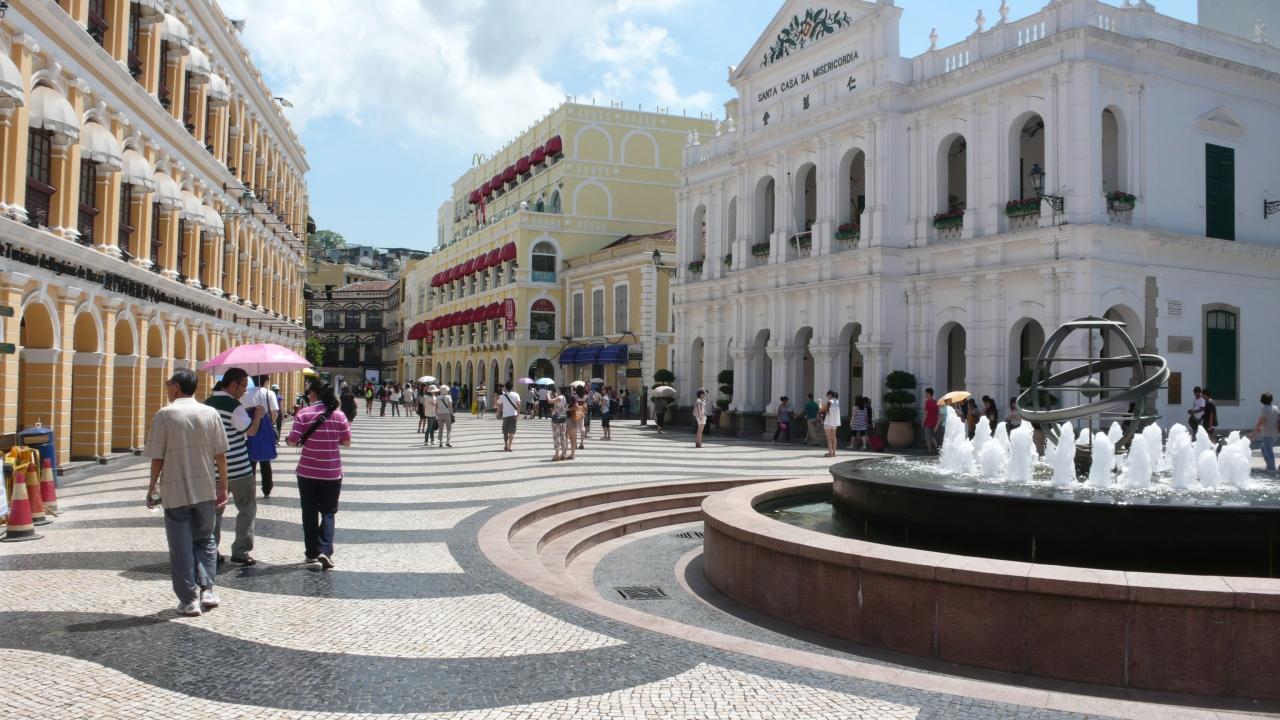 広場を囲む建物は、旧マカオ市政庁,郵便局,観光局,仁慈堂で、