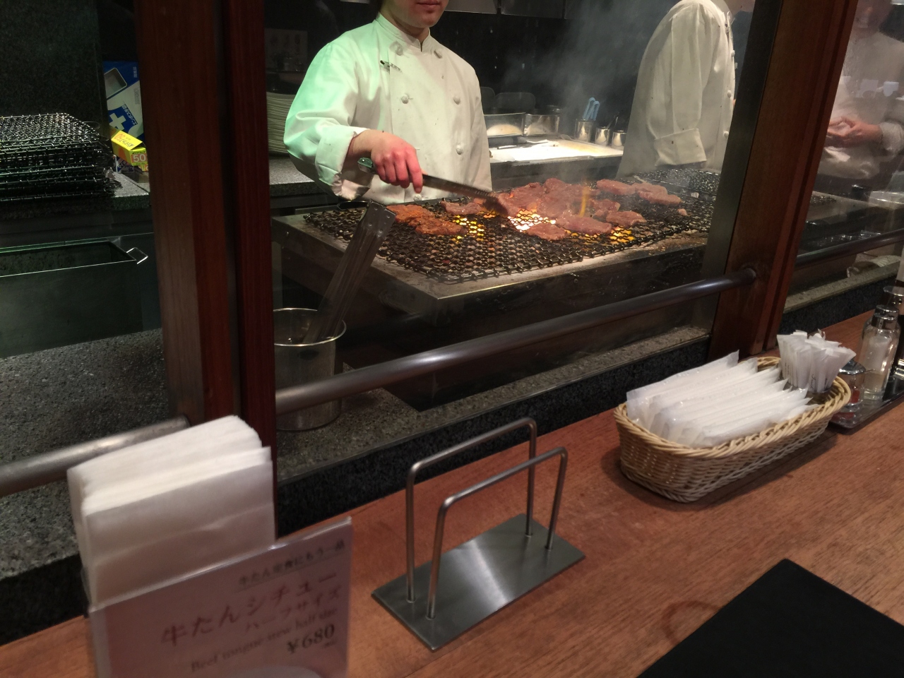 ガラス越に牛タンを炭火で焼く様子が見られます。- 旅行時期