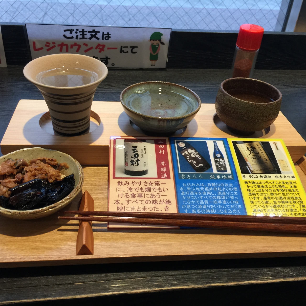 福井県のアンテナショップですが、イートインスペースで日本酒の試飲ができます。