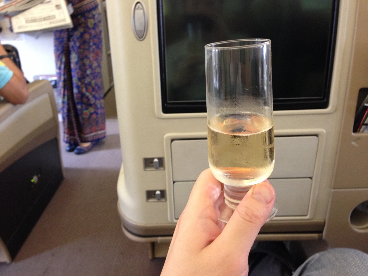 優先搭乗後、ウエルカムドリンクにシャンパンをいただき優雅な気分。