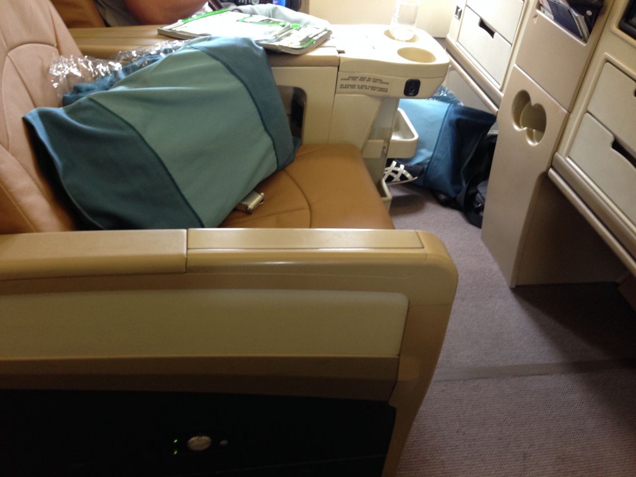 しかし、出発直前、人生初ビジネスクラスで失敗。エコノミーのようにバッグを前方座席下に置いていたところ、CAさんに棚に上げられました。シートベルト着用サインが消えると同時に機内サービスが始まったため、写真を撮れず。ビジネスクラスでは必要なものは小物入れに入れないといけないんですね・・・