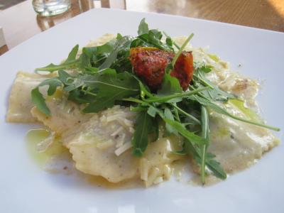 ブロッコリーのスープにメインはオススメというトリュフのラビオリを注文。