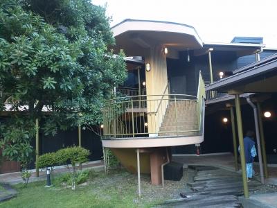 フロント、温泉、食事処のある本館と、バー・図書コーナーのある棟、宿泊棟が中庭を間にして配置されているのも、落ち着きを感じる要因の一つと感じます。