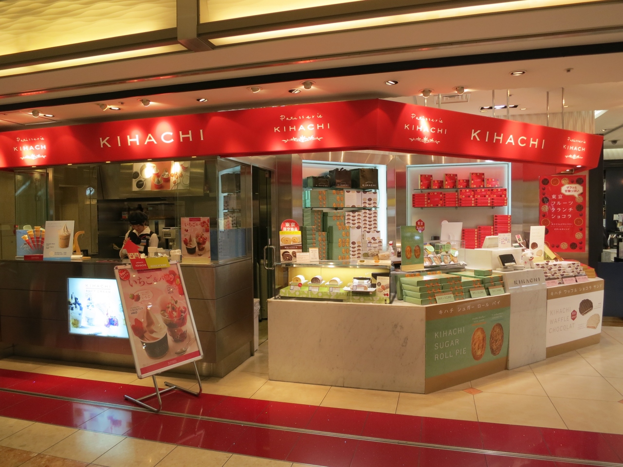 第1旅客ターミナル2階、人気洋菓子店が揃った特選洋菓子館にある洋菓子店です。こちらのお店では、東京限定商品の「東京ショコラロール」や羽田空港・東京駅限定の「ワッフルショコラサンド」が購入できます。デパ地下にはいるパティスリー キハチは、ケーキなど生ものの品揃えも豊富ですが、こちらの空港のお店は、日持ちするお土産用が中心で、残念ながらケーキの取り扱いはなく、生ものはロールケーキくらいでした。 店内には、アイスクリームなどデザートをテイクアウトして食べられるスタンドがあるので、空港でちょっと甘いものが食べたくなったときにおススメです。