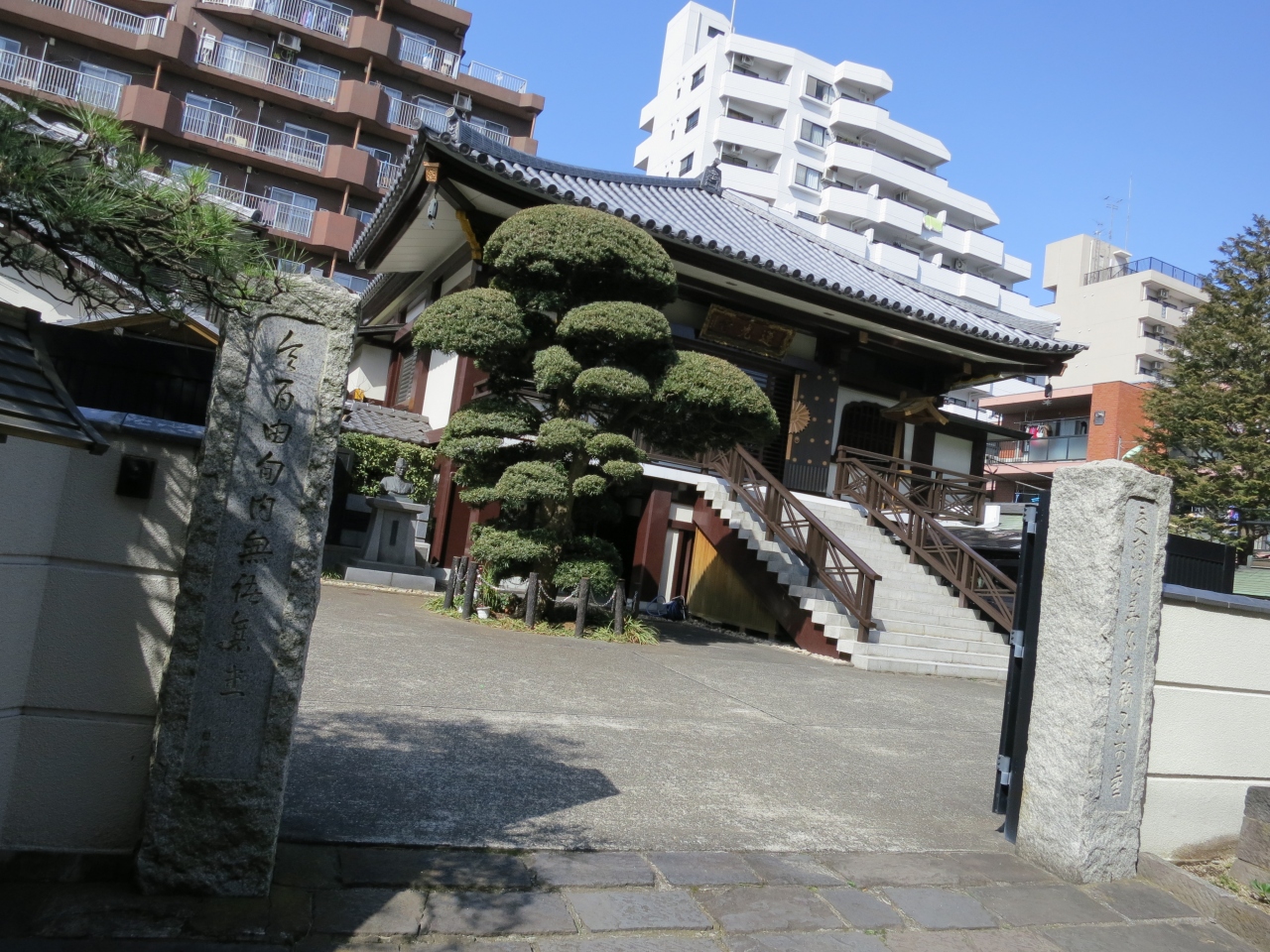 蚕糸公園近くにある、頂光山と号する日蓮宗寺院です。文禄3(1594)年に両国矢の倉(現在の中央区東日本橋)に開山し、正保元年(1644)に浅草新寺町(現在の台東区元浅草)に移転、文化3年(1806)の火災で焼失、大正4年(1914)に浅草の区画整理のため現在地に移転したようです。インド独立運動の英雄ネタジ・スバス・チャンドラボースの遺骨が安置されており、「ネタジ・スバス・チャンドラボースの碑」が境内にあります。環七通りを挟んで梅里公園の反対側辺りの住宅街の中にあります。