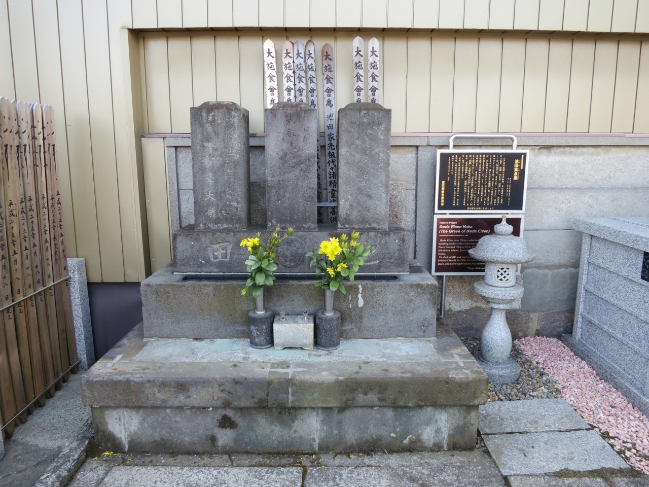 天正19(1591)年麹町十三丁目(現在の新宿区四谷2丁目)に開創され、明治40年当地へ移転してきた曹洞宗寺院の福寿院の本堂裏に、「東京都指定旧跡」となっている江戸後期の浮世絵師である池田英泉の墓があります。池田英泉は、江戸星ヶ岡(現在の千代田区永田町)に生まれ、多くの美人画や絵本、木曽街道六十九次などの風景画を描いた江戸後期の代表的な浮世絵師です。福寿院の本堂裏は墓地になっていますが、本堂の真裏すぐの場所に池田英泉のお墓はありました。