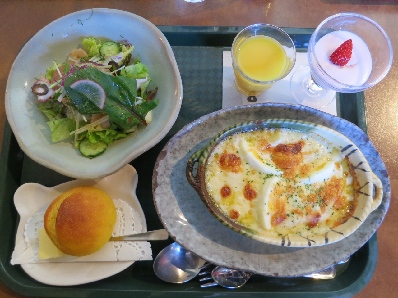 南国バイパス沿い(高須)にある高知で人気の現代企業社のレストランです。戦前は兵舎、戦後は学舎や牧舎として使用されていた建物をリメイクしたお店は、趣向を凝らした造りで、目を引きます。休日のお昼時に行きましたが、店内は混んでいました(待つほどではなかったです。駐車場は、運よく空きましたが、その後は空きを待っていました)。2階の店内(1階は駐車場)はテーブル席の他、座敷席もあり、小さな子連れだったので、座敷席に案内してもらいました(キッズチェアも2脚ありました)。読むのも楽しいメニューは和食から中華、洋食と幅広く、何か食べたいものが見つかると思います。この日は、グラタン・シー(グラタン・海の幸サラダ・グレインのパン・ミニジュース・デザート付き)¥1180をいただきました。ソーセージとゆで卵、マカロニの入ったグラタンは、子どもたちもよく食べました。海の幸サラダも新鮮で美味しかったです。一緒に行った家族は、百姓一揆¥1080、ピタゴラスの定食¥1280などをいただいていました。キッズメニュは5種類ほどあり、お会計時には好きなおもちゃが1つもらえるので、子どもの大好きなレストランです。家族揃っての外食にオススメの味良し雰囲気良しのレストランです。食後のデザート・ドリンクは半額になるサービスもやっています。
