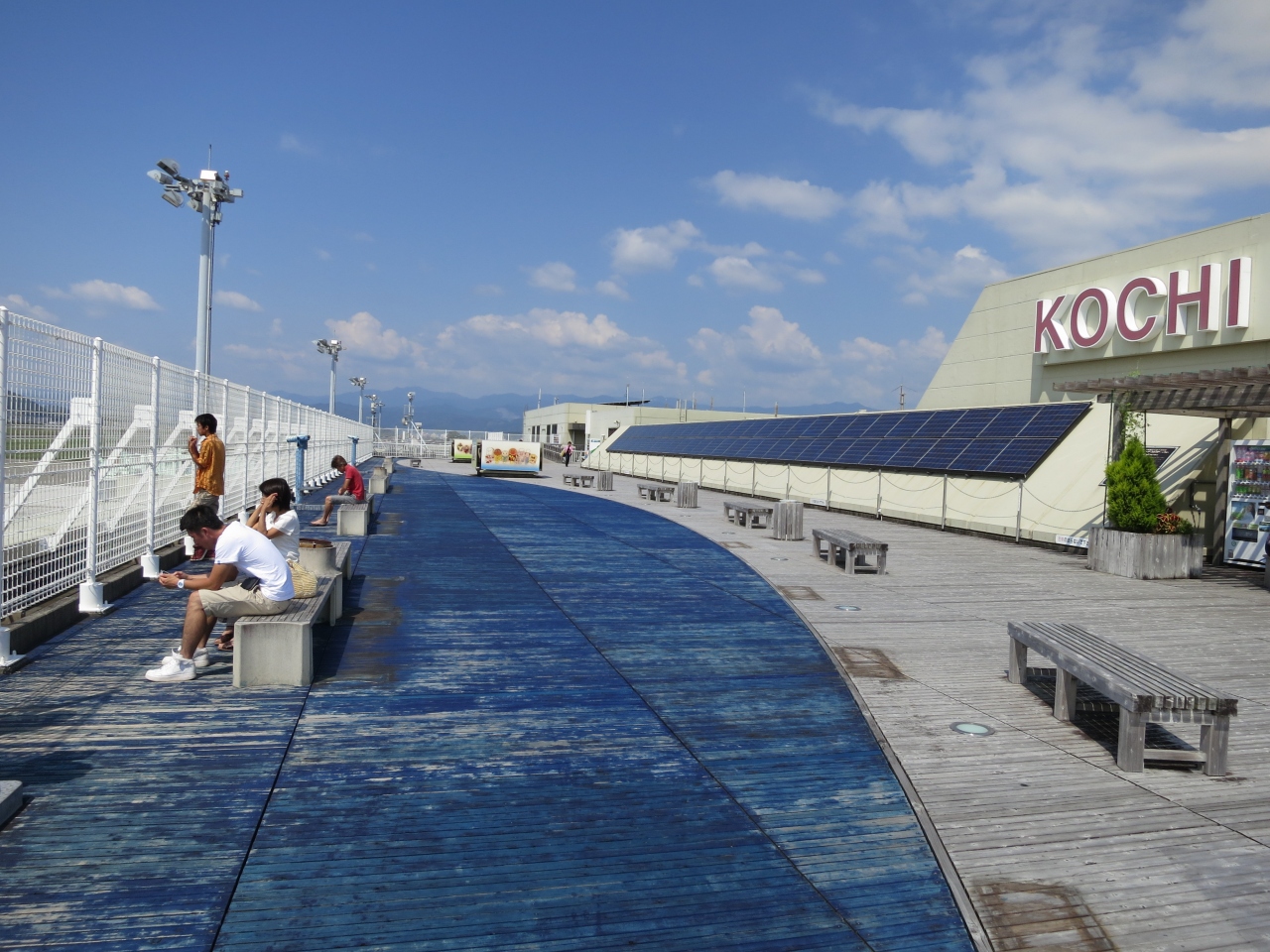 高知空港1階は、正面左側にANA、右側にJALのチケットロビーが、その間に到着ロビーがあります(授乳室や多目的トイレもあります)。2階には、レストランとお土産屋さん2軒(リニューアルされて広くなり内容も充実して、高知の有名なお土産はほぼ揃っています)、搭乗待合室があります。3階の送迎デッキは、以前は入場料\100でしたが、今は無料になっていて、ウッドデッキがしかれ、アンパンマンの絵が描かれていて、時間があるときに寄ると子どもは大喜びの場所です。すべてがコンパクトにまとまっていて、移動距離が短く、子連れで飛行機を利用するので、とても便利で助かります。