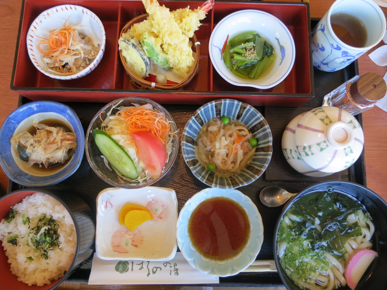 入浴後は、施設内のレストラン『楽山』でランチをいただきました。メニューは幅広く、お子様ランチにはおもちゃのプレゼントも付いていて、フェミレスのような充実度でした。「はる湯定食」¥980をいただきましたが、色々なものが入っていて、ボリュームもあり、美味しかったです。広々とした座敷でゆっくりお食事がいただけました。