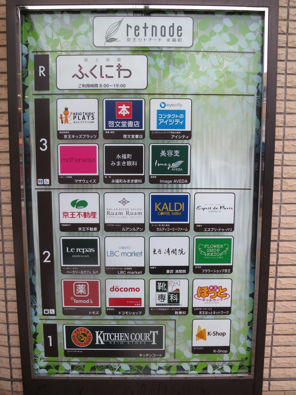 改札を出てすぐの駅ビルに、スーパーをはじめコンビニや、ドラッグストア、パン屋さん、和菓子店、洋菓子店、花屋さん、本屋さん、雑貨屋さん、美容室、認証保育所などが入っていて、駅利用者にはとても便利な施設です。屋上は、庭園になっていて、眺めのよい花と緑に囲まれた癒しの空間になっています。とりあえずの用事はだいたい終わってしまいそうな充実振りで、自宅近くにもあったらいいなぁと思う施設です。